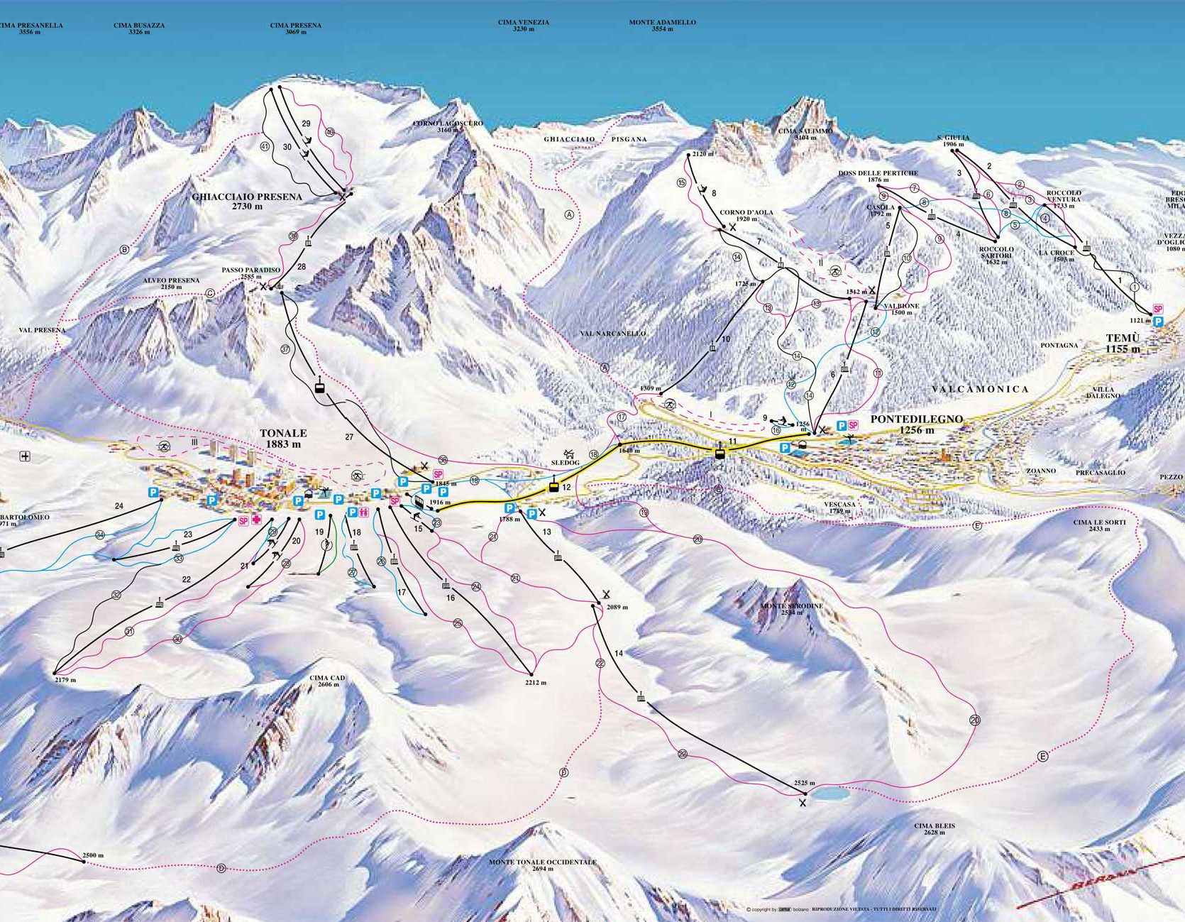 Adamello Ski es una amplia zona de esquí que abarca Pontedilegno, Passo Tonale, Alta Valle Camonica y Alta Val di Sole. Situado entre Lombardía y Trentino, el área destaca por el macizo del Adamello, que gracias a su geografía permite vacaciones en cualquier época del año y, sobre todo, esquiar de diciembre a mayo.