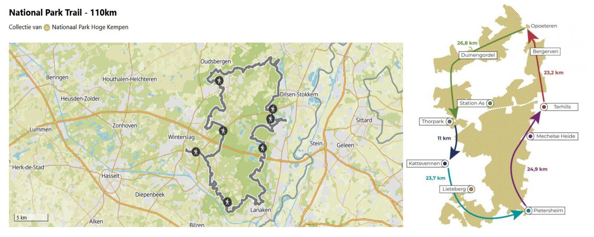 Le National Park Trail est un sentier de randonnée longue distance de 110 km, révélant les plus beaux paysages du Parc National Hoge Kempen. Ce chemin se distingue par sept montées, des landes étendues, de magnifiques marécages, de grands lacs, des dunes et des forêts parfumées. C’est l’une des rares randonnées en Flandre (région flamande de Belgique) où l’on peut marcher plus de 100 km sans voir de constructions ni de circulation.