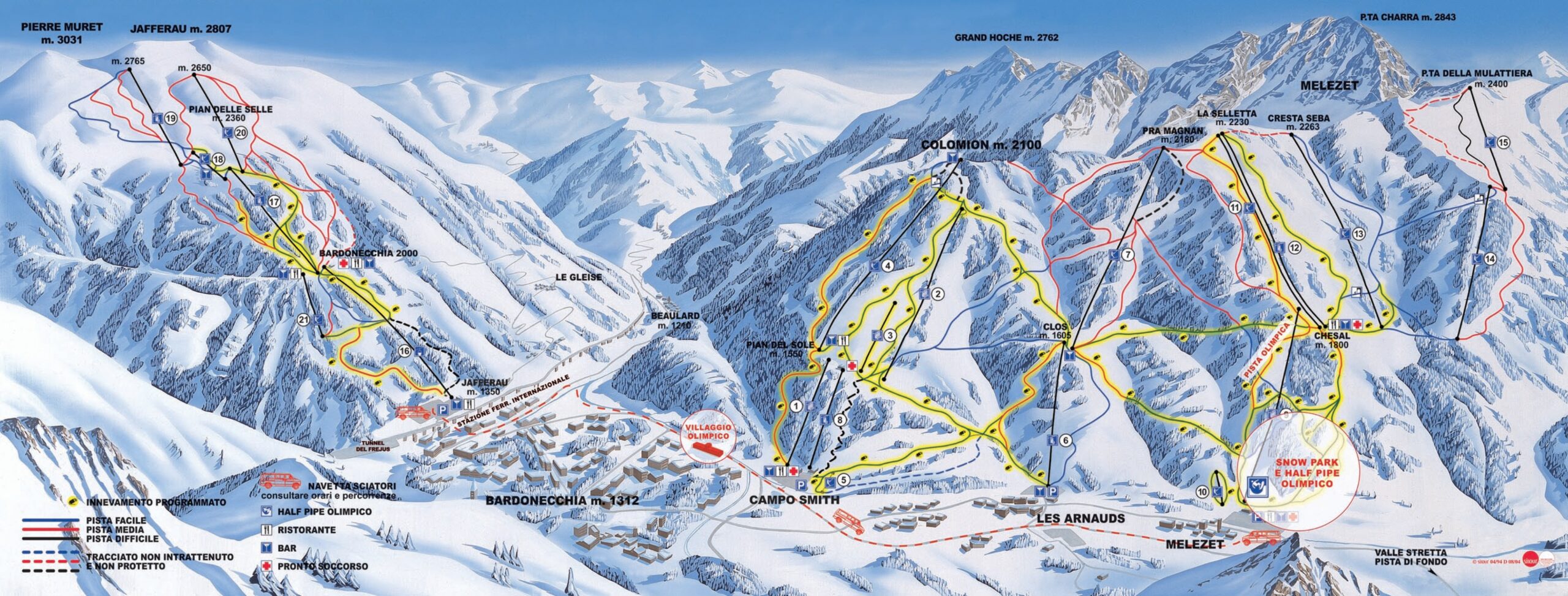 Choisir Bardonecchia pour ses vacances d’hiver, c’est profiter non seulement de pistes de ski et d’installations modernes, mais aussi d’une large gamme de services pour une escapade à la montagne vraiment ressourçante. Bardonecchia dispose de deux domaines skiables : Colomion-Les Arnaud-Melezet et Jafferau, soit une centaine de kilomètres de pistes skiables et une dizaine de kilomètres parfaitement préparés pour les balades en raquettes.