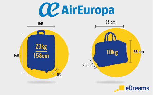 Het maximale gewicht van handbagage bij Air Europa Economy is 10 kg. Voor het Air Europa Business tarief gelden twee gewichtsklassen: tot 14 kg voor middellange afstand en tot 18 kg voor lange afstand. Bij de ATR-vloot is het maximale gewicht voor handbagage 8 kg en de maximale afmetingen zijn 55x35x20 cm.