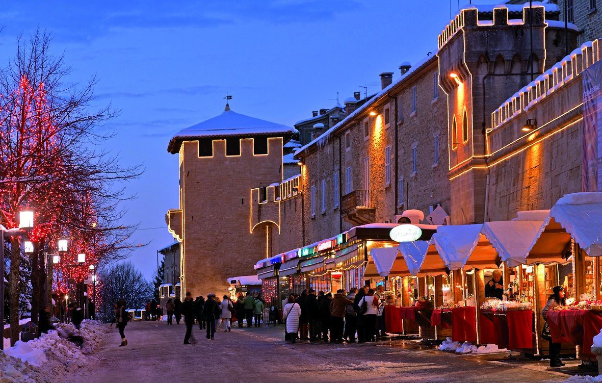 Há atrações para todos os gostos, começando pelos diversos presépios montados em vários pontos do Estado, incluindo um presépio vivo no Castelo de Montegiardino. O mercadinho de Natal de San Marino é um evento tradicional que vai além da simples exposição de produtos natalinos, embora se destaque uma vasta variedade de objetos, ideias de presentes para o Natal e degustações gastronômicas; tudo isso iluminado pelas luzes natalinas que tornam os bairros do centro histórico ainda mais especiais, mergulhados em uma atmosfera de conto de fadas atemporal.