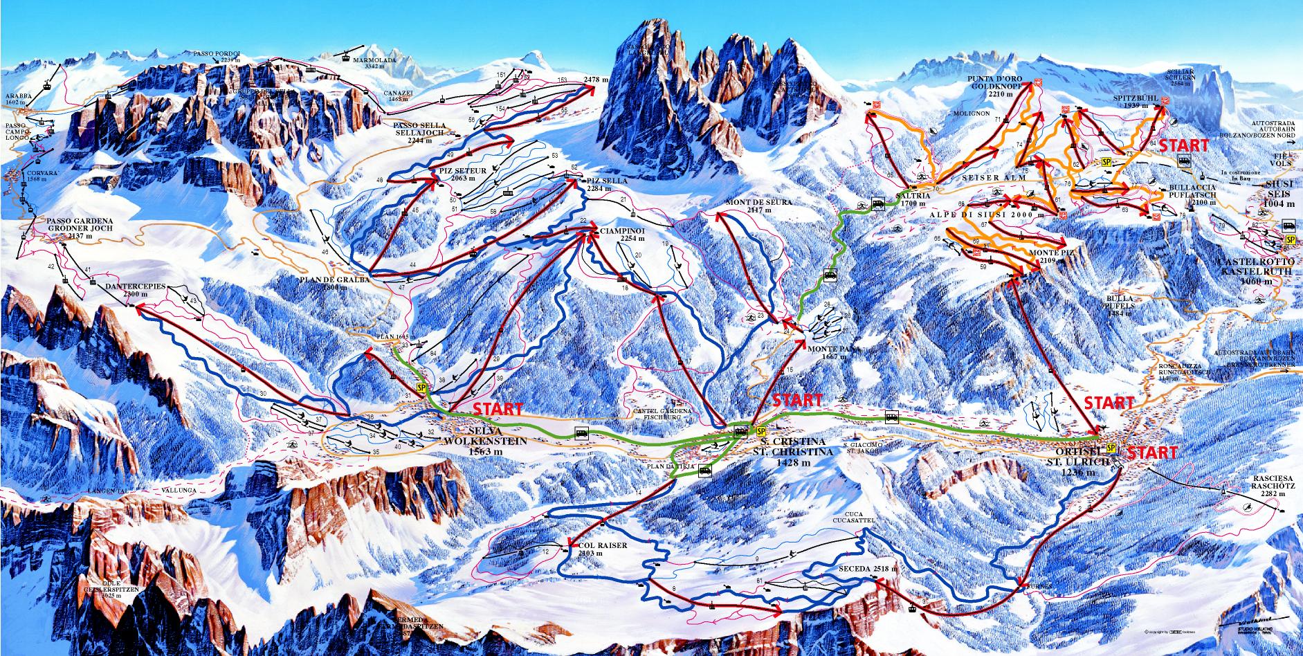Sejam vocês caminhantes ou esquiadores experientes, a Alpe di Siusi é um destino para visitar pelo menos uma vez na vida: este planalto dolomítico é o maior da Europa. A Alpe di Siusi é uma área de esqui muito valorizada por vários motivos, o principal deles é a ausência do vento, que permite descidas e caminhadas suaves e ensolaradas, mesmo com neve.