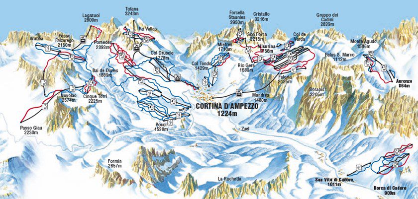 A maior parte das pistas de Cortina está situada na Tofana e nos complexos Cortina Cube e Cinque Torri, Col Gallina, Lagazuoi. Cortina d’Ampezzo também faz parte do consórcio Dolomiti Superski, um dos maiores centros de esqui do mundo devido à sua grande extensão territorial e mais de 1.220 km de pistas.