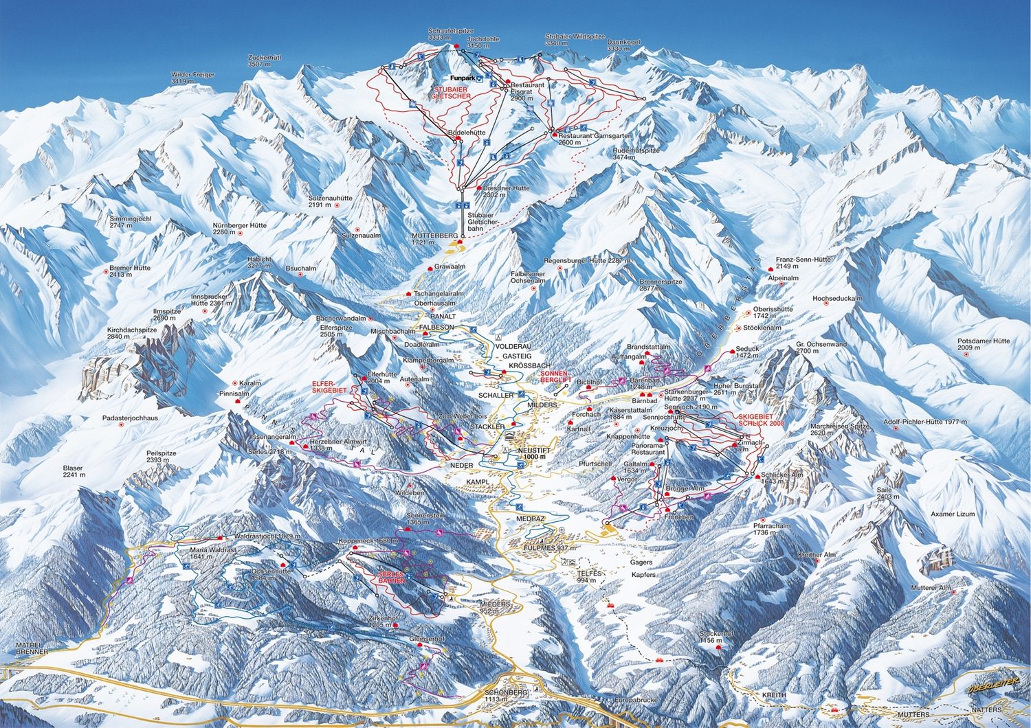 As três maiores áreas de esqui são o Schlick 2000, a montanha Hochserles e os teleféricos Elferlifte, paraísos tanto para esquiadores quanto para snowboarders que encontram no Stubai rampas e atrações impressionantes. Para quem gosta de sol, a vila de Telfes é a que mais se beneficia, com seus prados nevados — cercados por larícios — que prometem caminhadas na neve vigorosas, revigorantes e relaxantes ao mesmo tempo. Para esquiadores experientes, a recomendação é conhecer a área de esqui Schlick, que oferece grande variedade de inclinações, percursos e níveis de dificuldade, para divertir e desafiar todos os estilos nas neves eternas.