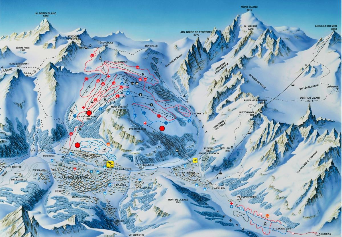 Per offrire una vacanza sulla neve di tutto rispetto, meritevole di essere chiamata settimana bianca, Courmayeur e il suo comprensorio sciistico spaziano con circa 100 km di piste che, grazie anche all’innevamento artificiale, permettono costantemente di fare snowboard e di sciare agevolmente.