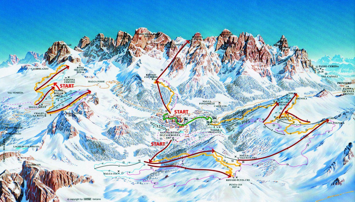 Le piste di San Martino di Castrozza più gettonate sono la Scandola, la Conca, la Valboneta e la Bellaria ma molto avvincenti sono anche le Colbricon, Tognola3, Sole, Cima Tognola e Rekord.